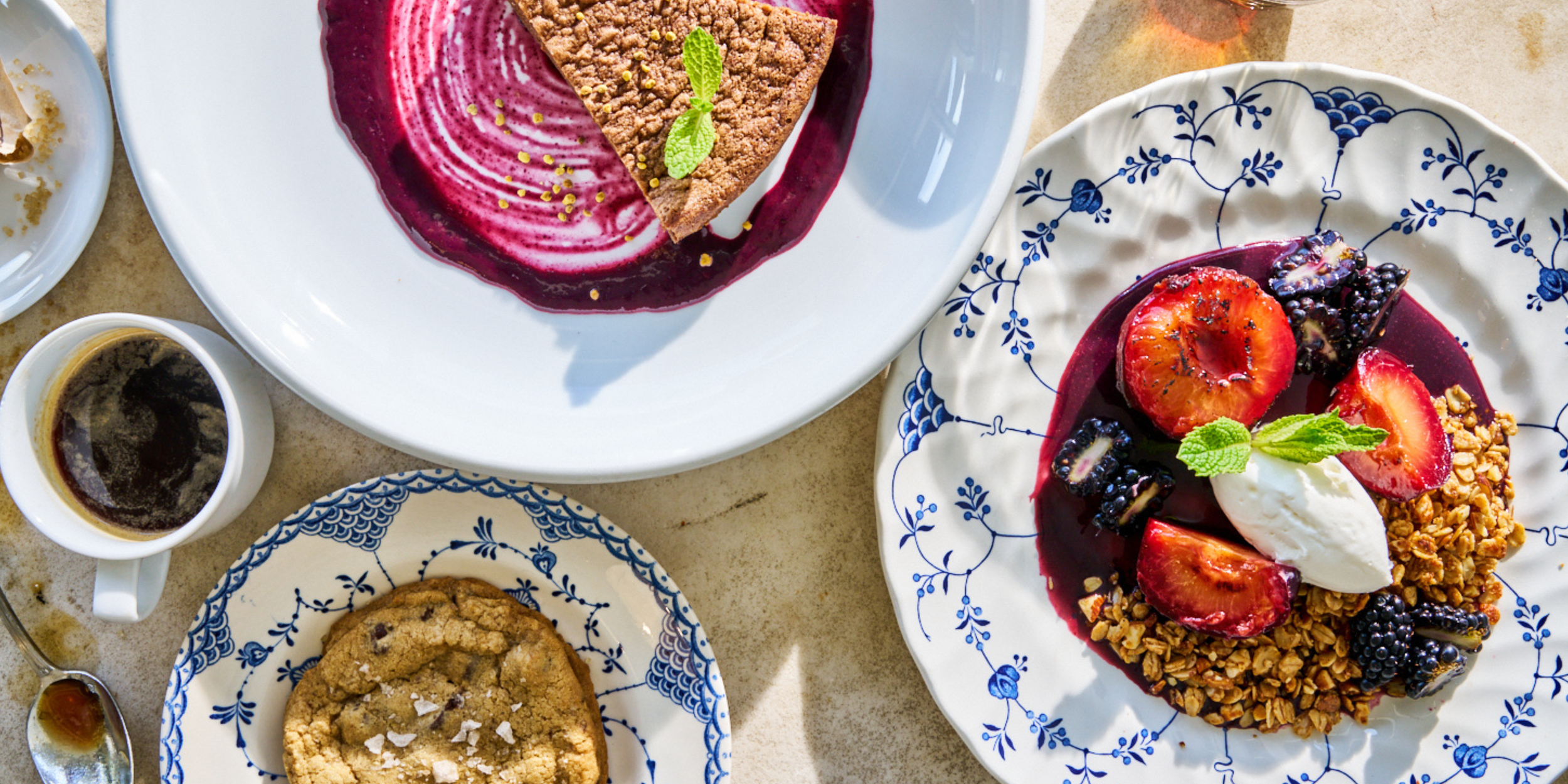 two crispy eggs, whipped ricotta, baby potatoes, bitter greens, olive gremolata